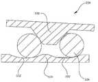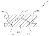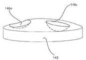 하측 부분(142)의 하측 표면(도시되지 않음)(144)과 상측 부분(134)의 상측 표면(132)은 인공 관절을 형성하기 위하여 뼈로 부착되도록 구성된다. 따라서, 부착 표면(132, 144)은 종래 기술에 공지된 바와 같이, 뼈, 등등으로의 결합을 유도하기 위하여 스파이크, 다공성 구조물 및 케미컬을 가질 수 있다. 이러한 표면들은 모든 도면에서 상세하게 나타나지는 않지만 필요 시 본 명세서에 공개된 모든 인공 관절의 일부분인 것으로 이해되어 진다. 추가적으로, 상측 부분(134) 및/또는 하측 부분(142)의 기저부는 인공 디스크(130)가 평평하게 형성되지 않으며 웨지 형태로 형성되도록 두께가 테이퍼 구성될 수 있다. 웨지 형태의 인공 디스크(wedge shaped artificial disc)는 환자의 척추 내에 형성되는 척추 전만증, 척추 후만증, 척추 측만증 또는 그 외의 다른 상태를 어드레스하는데(address) 유용하다. 웨지 형태의 인공 디스크를 제조하기 위해 테이퍼 구성된 두께를 가진 인공 관절은 본 명세서에 공개된 모든 인공 관절의 일부분을 이용하는 것으로 이해되어 진다. 이러한 부착 구조물 또는 테이퍼구성된 두께는 모든 상황에서 요구되지 않을 수 있거나 또는 특히 인공 관절이 핵 치환(nuclear replacement)을 위해 크기가 형성되는 상황에서 다양한 크기 또는 형상으로 구성될 수 있다.The lower surface (not shown) 144 of the