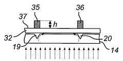 비변조 부분들(17, 18, 30, 및 31)로부터 들어오는 광의 인접하는 변조 부분들(15 및 16a-b)쪽으로의 최대 반사를 달성하기 위하여, 재지향 시트(14)는 x 및 y 방향들 둘다로 연장하는 비변조 부분들(17,18, 30 및 31)에 본질적으로 대응하는 연장들을 가진 재지향 구조들을 가져야 한다.In order to achieve maximum reflection towards the
