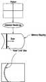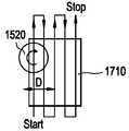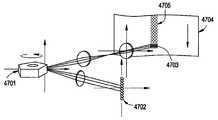 도 65B는 일실시예에 따른, 각각의 기록 유닛에 대해 필요한 조정과, 소재의 에지들 간의 순차적으로 라인들을 기록하는 단일-링 단일-포인트 스캐너의 단순화된 도면.65B is a simplified illustration of a single-ring single-point scanner that records the sequential lines between the edges of a material and the necessary adjustments for each writing unit, according to one embodiment.