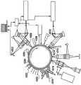 도 12B는 소재가 캡처되거나 통과될 수 있도록 처리 트랙 내에서 원통형 스테이지가 배열될 수 있는 방식을 도시하는 도면.12B illustrates a manner in which a cylindrical stage can be arranged within a processing track such that a material can be captured or passed through;