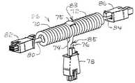도1 내지 도9와 함께 도10을 주로 참조하면, T자형 소스 케이블(26)은 밴드(75)에 의해 서로 체결되어 깔끔한 T자형 코일형 소스 전력 케이블 섹션(26)을 형성하는 2개의 코일형 트렁크 케이블 세그먼트(70, 72)를 포함하지만, 반드시 그러해야 하는 것은 아니다.  2개의 트렁크 케이블 세그먼트(70, 72)는 모두 공통의 브랜치 케이블 커넥터(78)에서 단말처리되는 각각의 단부(74, 76)를 갖는다.  입구 트렁크 케이블 세그먼트(70)의 다른 단부(80)는 입구 케이블 커넥터(82)에서 단말처리되고, 트렁크 케이블 세그먼트(72)의 다른 단부(84)는 출구 트렁크 커넥터(86)에서 단말처리된다.   상술한 바와 같이, 예를 들어 Molex(등록상표) 커넥터와 같은 임의의 적절한 케이블 커넥터가 사용될 수 있다.10, the T-shaped