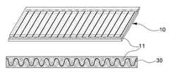 한편, 첨부한 도 5a 내지 도 5e에 도시된 바와 같이 본 발명의 염료감응 태양전지 루프패널을 구성하는 다수의 염료감응 태양전지 단위모듈(10)의 전극(11)에 소프트 와이어(30)를 적용할 때, 전극의 길이 및 폭, 면적 등을 고려하여 단일의 직선라인, 이중의 직선 라인, 지그재그 라인, 메쉬, 물결 라인 중 선택된 하나를 적용할 수 있다.5A to 5E,