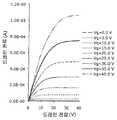 도 4b는 각각의 상이한 게이트 전압에 대한 박막 트랜지스터 디바이스의 드레인 전류의 드레인 전압 의존성을 도시하는 그래프이다.