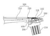 한편, 작동로드(300)의 후단에는 결합핀으로 연결된 클립(330)이 끼워져 결합되며, 클립(330)은 레버(130)에 연결되어 레버(130)가 전후방향으로 이동하면 연동하여 작동로드(300)를 전후방향으로 직전 이동시킨다.The