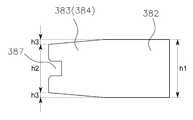 여기서, 도 8b 에 도시된 바와 같이, 상기 고정블럭(380)의 일측 삽입편(383)의 최상단부터 타측 삽입편(384)의 최하단까지의 높이(h2)는 몸체(382)의 높이(h1) 보다 적으며, 잔여 2 부분의 높이(h3)와 합산하여야 몸체(382)의 높이(h1)와 동일하도록 형성되어 전체적으로 각 삽입편(383,384)의 말단 부분 형상 이 사다리꼴 형상으로 형성되었는데, 이러한 각 삽입편(383,384)의 사다리꼴 형상은 상기 수직바(20)의 형성된 한쌍의 요홈(22)의 형상을 사다리꼴로 형성함으로써, 고정블럭(380)과 결합하는 수직바(20)의 고정력을 보다 공고하게 하기 위함이다.8B, the height h2 from the uppermost end of the one