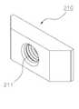 또한, 상기 걸림부(100)의 전방의 요입면(101)에 거치된 누름블럭(210)에 누름판(220)을 전후방향으로 이동시켜 누름판(220)을 레일(50)에 밀착 고정시키는 누름부조절나사(230)가 누름블럭(210)의 나사삽입공(211)으로 삽입되어 걸림부(100)의 정면에 형성된 통공(180)을 통하여 걸림부(100)의 내부공간으로 진입한다.The pushing