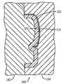 도 4 내지 도 6에 도시된 예시적인 실시예에 따라, 이러한 방법은 스티칭(113)[및 전술한 바와 같은 압축성 물질(124)]을 구비한 외피(122)가 성형된 제품의 A-표면의 일부(즉, 차량 착석자에게 보이는 성형된 제품의 측면)를 제공하는 부분적인 성형후 공정을 포함한다.  주형(140)은 제1 성형 섹션[코어(142)로 도시됨]과 제2 성형 섹션[공동(144)으로 도시됨]을 포함한다.  공동(144)은 공동(144)으로부터 연장하는 얇은 부재를 포함하는 돌출부[146; 예를 들어, 블레이드, 부재, 핀 등]를 포함한다.  커버스톡(110)이 공동(144)에 결합되며(예를 들어, 클램프, 스러스트 부재 등에 의해 제 위치에 유지되는 핀에 매달림), 주형(140)이 폐쇄된 다.  대안적인 실시예에 따라, 커버스톡이 코어에 결합된다.  용융된 수지가 주형 섹션들 사이의 공간(138) 내로 사출되고, 커버스톡(110)을 공동(144)에 대해 누르거나 또는 가압한다.  돌출부(146)는 커버스톡(110)의 에지를 제위치에 유지하여, 플라스틱이 그 주위로 유동하여 만입부 또는 경계부(128)를 형성한다(도 3 참조).  그런 다음, 또한 커버스톡(110)의 에지가 랩핑되고(wrapped) 기판(120)에 결합될 수 있다(예를 들어, 가봉, 용접, 잠금, 접합, 결합됨).  예시적인 실시예에 따라, 이러한 공정은 기판에 만입부를 형성하는 단계와, 만입부를 형성하는 기판의 일부를 형성하는 용융된 중합체 물질 내에 커버스톡의 적어도 하나의 에지를 둘러싸는 단계를 더 포함한다.  스티칭의 일부는 용융된 중합체 물질에 의해 둘러싸일 수 있다(예를 들어, 캡쳐, 접합, 결합 등).According to the exemplary embodiment shown in Figs. 4-6, this method is advantageous in that the