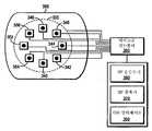 도 3B는 원격 제어 유닛의 환형 터치 센서와 연계하여 사용될 수 있는 일례의 스위치 및 관련 회로의 개략도이다.  탭핑과 스크롤링 제스쳐를 검출하는 것에 더하여, 일부 실시예에 있어서, 환형 터치 센서를 강하게 누르는 것이 또한 검출되며, 탭핑과는 구별된다.  많은 사용자들은 촉각적 피드백을 원하며, 강하게 누르는 것은 환형 터치 센서(300)의 이동과 수반되며, 일부 구성에 있어서는, "클릭"으로 확신한다(reassuring).  이를 성취하기 위하여, 환형 터치 센서(300)는 센서가 강하게 누르는 것에 응답하여 편향 또는 틸트되도록 하는 플렉시블 몰딩, 스프링, 또는 기타의 수단에 의해 PCB(printed circuit board)(365) 위에서 지지된다.  다수의 푸쉬 버튼 스위치(342 내지 354)가 PCB(356)와 환형 터치 센서(300) 사이의 공간에 배치된다.  이러한 푸쉬 버튼 스위치들은 멤브레인 형의 스위치, PCB(356)에 탑재되는 표면 탑재 기계적 스위치, 또는 기타의 공지의 스위치 종류들일 수 있다.   환형 터치 센서(300) 상의 특정의 위치에서 강하게 누르는 것에 응답하여, 환형 터치 센서는 하나 이상의 스위치가 작동되도록 편향 또는 틸트된다.  스위치들로부터의 신호들이, 환형 터치 센서(300)로부터 신호를 수신하도록 구성되는 마이크로컨트롤러(360)(예를 들어, 프로그램 가능한 시스템-온-칩(pSOC))에 의해 수신된다.  마이크로컨트롤러(360)는 신호들을 디바운스(debounce)하고, 스위치들과 환형 터치 센서(300)로부터의 신호들을 조정하여, 명령을 생성한다.  이러한 명령들은 프로그램 가능한 멀티미디어 컨트롤러(100)에 전송되며, RF 증폭기(370) 및 RF 송수신기(380), 또는, 예를 들어, IR 인터페이스, Bluetooth™ 인터페이스, ZigBee™ 인터페이스, WirelessUSB™ 인터페이스, Certified Wireless USB 인터페이스, 및/또는 WI-FI 인터페이스 등의 기타 종류의 인터페이스(390)를 이용하여 응답의 명령들이 반신(receive back)될 수 있다.3B is a schematic diagram of an exemplary switch and associated circuitry that may be used in conjunction with an annular touch sensor of a remote control unit. In addition to detecting tapping and scrolling gestures, in some embodiments it is also detected that pressing the annular touch sensor strongly is distinct from tapping. Many users desire tactile feedback, and a strong depression is accompanied by the movement of the