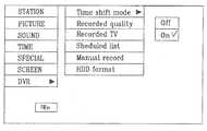 도 6a는 Timeshift Mode 서브 메뉴, Recorded Quality 서브 메뉴, Recorded TV 서브 메뉴, Scheduled List 서브 메뉴, Manual Recording 서브 메뉴, HDD Format 서브 메뉴가 디스플레이되는 예를 보이고 있다.FIG. 6A shows an example in which the Timeshift Mode submenu, the Recorded Quality submenu, the Recorded TV submenu, the Scheduled List submenu, the Manual Recording submenu, and the HDD Format submenu are displayed.