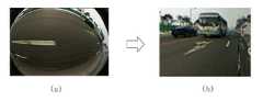 한편, 도 4는 사이드 카메라 영상에서 사이드 영역을 뷰 변환하는 동작을 나타낸 것이다. 도 4를 참조하면, 정보 제공 장치는 (a)와 같은 사이드 카메라 영상이 입력되면, 기 설정된 값에 따라 사이드 카메라 영상에서 지정된 사이드 영역을 검출한다. 이때, 정보 제공 장치는 검출된 사이드 영역의 영상을 뷰 변환하여 (b)와 같은 사이드 영역의 뷰 변환 영상을 생성한다.On the other hand, FIG. 4 shows an operation of performing a view conversion of the side area in the side camera image. Referring to FIG. 4, when the side camera image shown in (a) is input, the information providing apparatus detects a side area designated in the side camera image according to a predetermined value. At this time, the information providing apparatus generates a view conversion image of the side area as shown in (b) by performing a view conversion of the image of the detected side area.