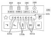예를 들어, 입력 표시창(121)에는 입력된 한글, 숫자 및 기호 등의 문자들이 표시되고, 각각의 문자에 대응하여 하단에 밑줄로 구분하여 나타낸다. 이 때, 편집하고자 하는 문자를 손으로 터치하면, 해당 문자들이 선택되고, 선택된 문자들의 하단 밑줄이 선택된 문자들을 선택되지 않은 문자들과 구별하여 표시된다. 이 실시예에서 입력 표시창(121)에 입력된 문자들이 '국민키보드입니다.'라는 문구이면, 마침표를 포함한 9 개의 문자들 각각의 하단에 파란색 밑줄(또는 실선)(121a)로 표시된다. 이 때, '키보드'를 편집하기 위해 사용자가 손으로 해당 문자들을 터치하면, 선택된 문자들 즉, '키보드'만 빨간색 밑줄(또는 점선)(121b)로 변경 표시되고, 동시에 입력 표시창(121)의 상단에 선택된 문자(즉, '키보드')들을 편집하기 위한 '복사하기' 아이콘(182), '삭제하기' 아이콘(184), '붙이기' 아이콘(186) 및 '취소' 아이콘(188)들이 표시된다. 따라서 입력 표시창(121)에 표시된 문자들 전부 또는 일부를 선택하여 사용자가 원하는 편집 작업을 수행할 수 있다. 여기서 '복사하기' 아이콘(182)은 선택된 '키보드' 문자들을 복사하는 기능을 수행하고, '삭제하기' 아이콘(184)은 선택된 '키보드' 문자들을 삭제하는 기능을 수행하고, '붙이기' 아이콘(186)은 선택된 '키보드' 문자들의 위치에 다른 복사된 문자들로 교체하는 기능을 수행하며, 그리고 '취소' 아이콘(188)은 선택된 '키보드' 문자들의 선택을 취소하는 기능으로, 선택된 '키보드' 문자들 각각의 하단에 표시된 빨간색 밑줄이 파란색 밑줄로 변경된다.For example, the