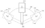 도 3은 엑스선 조사부(310)에 연결되어 있는 연결부(330)의 회전에 따라 엑스선 조사부(310)의 위치 변화와 엑스선 조사부(310) 자체의 회전을 도시한 도면이다. 연결부(330)는 엑스선 조사부(310)를 몸체와 연결하는 동시에 몸체와 독립적으로 시계 방향 또는 반시계 방향으로 회전이 가능하다. 도 3에서 엑스선 조사부(310)가 A 위치에 있을 때, 연결부(330)가 회전축(335)을 중심으로 반시계 방향으로 일정 각도만큼 회전하면 엑스선 조사부(310)는 B 위치에 오게 된다. 반대로 연결부(330)가 회전축(335)을 중심으로 시계 방향으로 일정 각도만큼 회전하면 엑스선 조사부(310)는 C 위치에 오게 된다. 엑스선 조사부(310)가 위치하는 A, B, C 점을 모두 연결하면 원호의 궤도(350)가 된다. 연결부(330)가 일정 각도 만큼 회전하게 되면 연결부(330)에 결합되어 있는 엑스선 조사부(310)의 위치도 변하게 되고, 연결부(330)가 회전한 각도 만큼 엑스선 조사부(310)는 원호의 궤도(350)를 그리게 된다. 엑스선 조사부(310)의 위치를 변경함에 따라 엑스선 조사부(310)의 중심이 그리는 궤적은 위에서 언급한 바와 같이 원호 형태가 될 수 있고, 경우에 따라서는 원형 또는 직선 형태가 될 수도 있다. 이하에서는 설명의 편의상 엑스선 조사부(310)가 일정한 범위 내에서 위치를 변경하는 경우로 설명하므로 원호 형태를 기준으로 설명한다.3 is a view showing a change in the position of the
