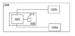 도 9a-9c는 백플레이트를 가진 인쇄회로보드 기판의 예들을 도시한다. 인쇄회로 보드가 기판으로서 도 9a-9c에서 예시되고 이하에서 설명된 반면에, 다른 기판들이 또한 가능하다. 예를들어, 기판은 가요성 플라스틱 기판과 같은 플라스틱 기판을 포함할 수 있다. 일부 구현들에서, 기판은 기판상에 양호한 RF 특징들을 가진 수동소자들을 직접 형성하는 것을 가능하게 하는 전기 특성들을 가지지 않은 임의의 물질을 포함할 수 있다. 다른 구현들에서, 기판은 실리콘과 같은 고가의 기판들을 포함하는데, 왜냐하면 이러한 기판이 기판의 크기를 감소시키는데 유용할 수 있기 때문이다. 도 9a는 디바이스(1010)와 전기 접촉하는 인쇄회로보드(PCB)(1005) 및 디바이스(1010)와 전기 접촉하는 수동 컴포넌트(들)(1015)의 예를 도시한다. 디바이스(1010) 및 수동 컴포넌트(들)(1015)는 PCB(1005)상의 영역(1020)을 점유한다. 디바이스(1010)는 또한 RAM 또는 다른 이러한 전자 칩들과 같은 1개, 2개 또는 그 초과의 전기 컴포넌트들(1025a 및 1025b)과 전기 접촉할 수 있다. 디바이스(1010)는 주문형 집적회로(ASIC), 필드-프로그램가능 게이트 어레이(FPGA) 또는 다른 프로그램가능 논리 회로, (예를들어, 셀 폰 또는 모바일 디바이스를 위한 무선 통신용) 트랜시버, (예를들어, 디스플레이용) 드라이버, 및/또는 라디오-주파수(RF)용 전력-관리 집적회로(PMIC) 또는 다른 애플리케이션들 중 하나 이상을 포함할 수 있다. 일부 구현들에서, 디바이스(1010)는 수동 컴포넌트에 전기적으로 연결되도록 구성되는 임의의 전기 또는 전기기계적일 수 있다(예를들어, EMS 센서 또는 다른 EMS 디바이스). 도 9a에 도시된 구현에서, 수동 컴포넌트(들)(1015)는 레지스터들, 인덕터들 또는 커패시터들과 같은 개별 컴포넌트들을 포함할 수 있다. 일부 구현들에서, 수동 컴포넌트들은 공진기들을 포함할 수 있다.9A-9C illustrate examples of printed circuit board substrates having backplates. While the printed circuit board is illustrated in Figures 9a-9c as a substrate and described below, other substrates are also possible. For example, the substrate may comprise a plastic substrate such as a flexible plastic substrate. In some implementations, the substrate may include any material that does not have electrical properties that enable it to directly form passive elements with good RF characteristics on the substrate. In other implementations, the substrate includes expensive substrates, such as silicon, because such substrates can be useful in reducing the size of the substrate. 9A illustrates an example of a printed circuit board (PCB) 1005 in electrical contact with a