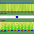 이 후 수평 전계(E1)를 인가하여 도 6 (b) 및 도 7 (b)와 같이 프리틸트 되도록 한다.Thereafter, the horizontal electric field E1 is applied and pre-tilted as shown in Figs. 6 (b) and 7 (b).