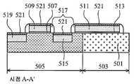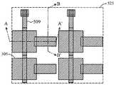 도 5b의 단면 B-B'에서, STI 부분(501)만을 갖는 기판(501)이 바닥 전극(511) 아래에 도시되어 있다.  게이트 전극(513)은 바닥 전극(511)과 기판(501) 사이에 배치된다.  스페이서(517)는 도 5a 및 도 5b에 도시된 바와 같이 바닥 전극(511)의 측면을 둘러싼다.5B, a