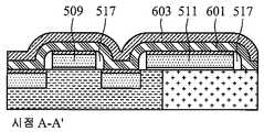 도 6a 및 도 6b는 작업(415, 417) 후에 단면도 및 오버레이 다이어그램에서 부분적으로 제조된 메모리 셀을 도시한다.  도 6a는 도 5c의 절단선 A-A'에 대응하는 단면이다.  도 6b는 도 5c의 절단선 B-B'에 대응하는 단면이다.  도 6a 및 도 6b는 트랜지스터 게이트(509)와 스페이서(517) 위에 그리고 바닥 전극(511)과 스페이서(517) 위에 정합하게 증착되는 제1 유전체 물질층(601)을 도시한다.  상부 전극 물질(603)은 또한 제1 유전체 물질층(601) 위에 정합하게 증착된다.Figures 6A and 6B illustrate memory cells partially fabricated in cross-section and overlay diagrams after task 415,417. 6A is a cross-section corresponding to the cutting line A-A 'in FIG. 5C. Fig. 6B is a cross-section corresponding to the cut line B-B 'in Fig. 5C. 6A and 6B illustrate a first layer of