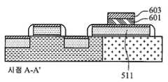 다시 도 4를 참조하면, 작업(419)에서, 제1 유전체 물질층과 상부 전극 물질은 각각 RRAM 구조체 내로 패터닝된다.  패터닝은 포토레지스트가 증착되고, 포토레지스트를 노출시킴으로써 패턴이 형성되며, 포토레지스트를 현상하여 포토레지스트 패턴을 생성하는 포토리소그래피 작업을 포함한다.  이어서, 포토레지스트 패턴이 에칭 마스크로서 사용되어 RRAM 구조체의 원하는 부분을 보호한다.  이 작업에 사용되는 포토마스크는 전통적인 CMOS 제조 프로세스에서 사용되지 않는 유일한 것이다.  다른 작업에 사용되는 포토마스크는 전통적인 CMOS 제조 프로세스에서의 작업과 같이 미리 포함된다.  따라서, 본 개시의 임베디드(embedded) RRAM은 전통적인 CMOS 제조 프로세스에 비해 단 하나의 추가 포토마스크를 이용하여 그리고 RRAM 스택이 트랜지스터 위에 형성되는 다른 RRAM 제조 프로세스에 비해 적어도 2개 더 적은 포토마스크를 이용하여 제조될 수 있다.  시야 A-A'에서 도 7a에 도시된 바와 같이, 제1 유전체 물질(601)과 상부 전극 물질(603)은 액티브 영역으로부터 제거되고 바닥 전극(511)으로부터 부분적으로 제거된다.  시야 B-B'의 도 7b의 단면에서, 제1 유전체 물질(601)과 상부 전극 물질(603)은 제거되지 않는다.  도 7c에 도시된 바와 같이, 이에 따라 제1 유전체 물질(601)과 상부 전극 물질(603)의 스트립이 트랜지스터 게이트 구조체(509)에 평행한 다수의 바닥 전극을 가로질러 형성된다.Referring again to Figure 4, at