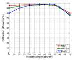 도 5를 참조하면, Red는 10° ~ 60° 사이에서 90% 이상의 회절효율 갖고, green은 10° ~ 60° 사이에서 90% 이상의 회절효율을 가지며, blue는 30° ~ 60° 사이에서 90% 이상의 효율을 갖는다. 즉, 두 빔의 입사각의 합이 30° ~ 60° 범위 내에서는 기록구조와 관계없이 최소 90% 이상의 회절효율을 갖는 격자의 설계가 가능함을 알 수 있다.