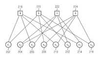 도 2를 참조하면, 상기 LDPC 부호의 상기 Tanner 그래프는 8개의 변수 노드들 x1(202), x2(204), x3(206), x4(208), x5(210), x6(212), x7(214), x8(216)과 4개의 검사 노드(check node)(218, 220, 222, 224)들로 구성되어 있다. 여기서, 상기 LDPC 부호의 패리티 검사 행렬 H1의 i번째 열과 j번째 행은 각각 변수 노드 xi와 j 번째 검사 노드에 대응된다. 또한, 상기 LDPC 부호의 패리티 검사 행렬 H1의 i번째 열과 j번째 행이 교차하는 지점의 1의 값, 즉 0이 아닌 값의 의미는, 상기 도 2와 같이 상기 Tanner 그래프 상에서 상기 변수 노드 xi와 j번째 검사 노드 사이에 선 분(edge)이 존재함을 의미한다.2, the Tanner graph of the LDPC code includes eight variable nodes x1 (202), x2 (204), x3 (206), x4 (208), x5 (210)6 212, x7 214 and x8 216 and four
