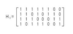 도 1은 4 개의 행(row)과 8 개의 열(column)로 이루어진 상기 LDPC 부호의 패리티 검사 행렬 H1의 예를 나타낸다. 도 1을 참조하면, 열이 8개 있기 때문에 길이가 8인 부호어(codeword)를 생성하는 LDPC 부호를 의미하며, 각 열은 부호화된 8 비트와 대응된다.1 shows an example of a parity check matrix H1 of the LDPC code including four rows and eight columns. Referring to FIG. 1, an LDPC code is generated to generate a codeword having a length of 8 because there are eight columns. Each column corresponds to eight encoded bits.