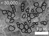 도 2는 도 1의 SEM 사진 화상의 입자의 외측 가장자리를 마킹한 사진이다.