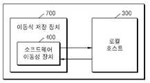 도 7은 본 발명에 따른 소프트웨어 이동 장치가 이동식 저장 장치에 담겨져 있는 예를 나타낸다.  도 7을 참조하면, 본 발명에 따른 소프트웨어 이동 장치(400)는 이동식 저장 장치(700)에 저장되고, 이러한 이동식 저장 장치(700)가 이동할 로컬 호스트 장치(300)에 삽입되거나 로딩되어 사용되는 형태를 나타낸다.7 shows an example in which the software moving device according to the present invention is contained in a removable storage device. Referring to FIG. 7, a