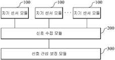 도 2에 도시된 바와 같이, 본 발명에 따른 자기센서에 의한 아크검출을 위한 다중 부스바용 간섭 보정식 일점감지 전류센서는, 자기 센서 모듈(100), 신호 수집 모듈(200) 및 신호 간섭 보정 모듈(300)을 포함하여 구성될 수 있다. 보다 구체적으로, 본 발명에 따른 자기센서에 의한 아크검출을 위한 다중 부스바용 간섭 보정식 일점감지 전류센서는 도 3에 도시된 바와 같이, N개의 부스바(10)와 각각 인접하여 설치된 N개의 자기 센서 모듈(100)은 각각의 위치에서 전류량(I0, I1, …, In, …, IN)을 측정하고, 신호 수집 모듈(200)은 측정된 전류량(계측 신호)을 수집하여 신호 간섭 보정 모듈(300)에 전달하며, 신호 간섭 보정 모듈(300)에서는 부스바 상호 간의 간섭량을 연산하여 간섭이 제거된 보정 전류 값(I'0, I'1, …, I'n, …, I'N)을 도출할 수 있다.As shown in FIG. 2, the multi-bus bar interference compensating single point sensing current sensor for arc detection by the magnetic sensor according to the present invention includes a