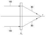 그리고 SLM(200)의 전면에는 SLM(200)과 관람자 사이의 공간 내의 적절한 위치에 입체 영상의 초점을 맞추어 주는 박막 평판형 수렴 렌즈(FL)를 더 포함할 수 있다.  박막 평판형 수렴 렌즈(FL)의 초점은 다양하게 설정할 수 있다.  예를 들어, SLM(200)과 관람자 사이의 최적의 위치에 초점을 설정할 수도 있다.  다른 방법으로는 관람자의 눈에 직접 초점을 맞출 수도 있다.  이 경우에는 좌안과 우안에 교대로 좌안 영상과 우안 영상이 전송하도록 하는 것이 바람직하다.  본 발명의 핵심인 박막 평판형 수렴 렌즈(FL)에 대해서는 아래에서 더 상세히 설명한다.Further, the