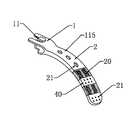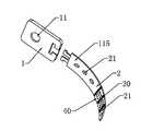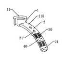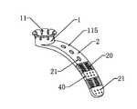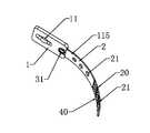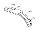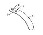 도 36은 본 발명에서 언급한 유연 폴리머를 채택하여 제작된 탄성 모듈을 포함한 이식형 연구개 지지물의 구조예시도로서, 본 실시예는 강성모듈과 탄성 모듈을 포함하고, 지지물의 강성모듈 부분을 힘껏 구부려 지지물의 강성모듈이 외부힘의 작용 하에 소성변형이 발생하여 지지물의 완곡 각도를 조절할 수 있게 되어 연구개 지탱 정도를 제어, 조절할 수 있으며, 탄성 모듈은 지지물이 좋은 유연성을 유지하도록 하여 연구개의 흔들림으로 인해 움직여도 연구개가 이완상태를 회복하게 하는 작용을 하고, 즉 탄성 모듈 변형 후의 회복력은 연구개가 이완상태로 회복하도록 돕고 연구개를 위로 올리고 당기는 작용을 하는, 구조 예시도,