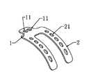 도 45는 경구개 연결부의 연결구조로 버클형구조를 채택한 본 발명의 이식형 연구개 지지물의 구조예시도로서, 본 실시예에서 경구개 연결부를 버클형구조로 설계하여 사용 시 경구개에 스루홀을 뚫어 버클이 경구개의 스루홀을 관통하여 경구개에 맞물려 고정구조를 형성하고, 힘껏 지지물을 구부려 소성변형을 발생시켜 지지물의 완곡 각도를 조절하여 연구개의 지탱 정도를 제어 및 조절하며, 본 실시예의 제작자재는 티타늄금속, 특히 니티놀 합금(Nitinol합금)을 사용하여 제작하고, 형상기억합금(일반적으로 회복온도가 20℃ 내지 33℃인 기억합금을 선택)의 형상기억특성을 이용하여 제품의 회복온도 이상 요구되는 기하형에 설정하며, 사용 시, 찬물(0℃-15℃)에서 경구개 연결부의 연결구조를 축소시키고, 경구개에 뚫은 스루홀을 관통한 후 체온의 작용 하에 경구개 연결부의 연결구조는 성형열처리 시 설정한 기하형태를 회복하여 본 발명의 이식형 연구개 지지물을 경구개에 튼튼하게 고정하게 되는 구조예시도,