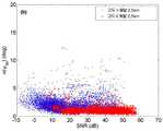 도3은 밝은 띠가 보이는 층류 및 대류성 강우가 혼재하는 기간의 SNR과 상관계수 평면에서의 각 관측 결과의 분포를 나타낸다. 파란색 점은 해발 2.5km 위의 모든 데이터를 의미하고, 비, 눈, 혼합형 강수가 포함되어 있다. 붉은색 점은 강수지역에 대한 자료만을 의미한다 (해발 0.8km 와 2.5km 사이). 도3의 자료는 모든 형태의 강수 카레고리에 대한 강우 형태의 카테고리의 분포에 있어서 상당 부분 겹치고 있다는 것을 보여주며, 이는 일정한 상관계수를 사용하여 융해층을 탐색하는 것이 낮은 SNR에 대해서는 적절하지 않다는 것을 의미한다.Fig. 3 shows the distribution of each observation result in the correlation coefficient plane and the SNR in a period in which laminar flow and convective rainfall having a bright band are mixed. The blue dot means all data above 2.5 km above sea level, and includes rain, snow and mixed precipitation. The red dot means only the data for the precipitation area (between 0.8km and 2.5km above sea level). The data in FIG. 3 show that there is a significant overlap in the distribution of the categories of precipitation form for all types of precipitation currecies, indicating that searching for the melting bed using a constant correlation coefficient is not appropriate for low SNR it means.