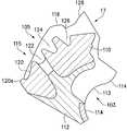 전방 안정화 단부(20)가 바람직하게는 상부 및 하부 표면(22, 24)에 의해 형성되는 삼각형 형상을 갖는 반면, 상부 전방 코너의 측방향 돌출을 감소시키기 위하여 기울어진 측면 표면을 갖는 다른 형상도 이용될 수 있다.  이러한 구성에서는, 기울어진 측벽이 대체적인 사다리꼴 형상을 형성할 수 있다.  다른 예로서, 상부 코너는 상부 코너를 내부로 이동시키도록 모따기(chamfer)될 수 있다.  이러한 챔퍼는 측벽 및/또는 상부벽을 제거하기 위하여 또는 측벽과 상부벽을 잇기 위하여 형성된다.  다른 예에서는, 평평한 표면이 바람직하다 하더라도, 경사진 표면이, 예를 들어 전체적으로 반구 형태의 전방 단부를 형성하도록 만곡될 수 있다.While the