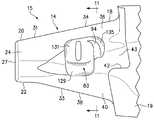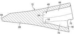 노즈(14)는 추가로 상부벽(31) 및 하부벽(33)에 의하여 부분적으로 한정된다(도 3 및 도 10).  상부 및 하부벽(31, 33)은 전방 추진 표면(27)을 향해 모여, 강도 및 관통 능력의 절충을 제공하도록 일반적인 웨지(wedge) 형태를 형성한다.  그러나 전방 안정화 표면을 구비하여 형성되는 일반적인 노즈와는 달리, 상부벽(31)의 중심부(34)는 안정성을 희생시키기 않으면서도 침투력의 강화 및 얇은 외부 프로파일을 위해 전방 단부(20)를 통해 추진 표면(27)까지 하부 벽(33)을 향해 지속적으로 모아진다.  전방 단부(20)를 통한 상부벽(31)의 이러한 지속된 가늘어짐(tapering) 및 이에 수반되는 노즈의 슬리밍(slimming)은 안정화시키는 지지를 제공하도록 경사진 안정화 표면(24)을 사용하기 때문에 가능하다.The