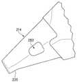 본원발명의 다른 태양에서, 노즈는, 강도 및 침투력의 절충점으로서 통상적인 웨지 형상을 가지도록 상부 집중식 벽(converging wall) 및 하부 집중식 벽을 포함한다. 그러나 종래 구성과는 대조적으로, 원하는 안정성을 지속적으로 제공하면서도 침투력을 향상시키기 위하여 상부벽이 전방 단부에 걸쳐 하부벽을 향해 계속적으로 모아진다(converge).In another aspect of the invention, the nose includes a converging wall and a bottom converging wall to have a conventional wedge shape as a compromise between strength and penetration. However, in contrast to conventional arrangements, the top wall continues to converge toward the bottom wall over the front end to improve penetration while still providing the desired stability.