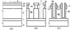 개공 후에 등방성 에칭을 행하고, 제 3 성형막(21) 부분에 오목부(Va)를 형성한 후 전극 보호막(7)을 성장시킨다. 전극 보호막(7)은 캐패시터 형성시의 제 2 성형막(2)과 제 3 성형막(21)과 제 4 성형막(31)의 제거에 사용하는 에칭액에 대하여 충분한 에칭 레이트비를 갖는 성형막인 것이 바람직하고, 또한 오목부(Ka)의 전체에 균일하게 성막할 수 있고, 또한 오목부(Ka)의 중복부에 형성한 오목부(7)를 완전히 매설할 수 있는 막인 것이 바람직하다. 예를 들면, ALD(Atomic Layer Deposition)법을 사용한 질화막이나 5산화탄탈(Ta2O5)막 등을 들 수 있다.Isotropic etching is performed after the opening, and a concave portion (Va) is formed in the third molding film (21), and then the electrode protecting film (7) is grown. The electrode