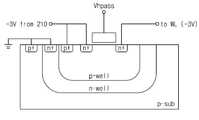 도 13은 고전압 전달 회로(220)를 통해 패스 전압이 공급될 때 웰 바이어스 조건을 보여주는 도면이고, 도 14는 고전압 전달 회로(220)를 통해 음의 전압이 공급될 때 웰 바이어스 조건을 보여주는 도면이다. 고전압 전달 회로(220)를 통해 패스 전압(Vpass)이 공급될 때, 도 13에 도시된 바와 같이, p-웰, n-웰, 그리고 기판은 접지 전압에 연결되고, 스위치 트랜지스터의 게이트에는 패스 전압(Vpass)보다 높은 고전압(Vhpass)이 공급될 것이다. 고전압 전달 회로(220)를 통해 음의 전압(예를 들면, -3V)이 공급될 때, 도 14에 도시된 바와 같이, n-웰과 기판은 접지 전압에 연결되고, p-웰은 음의 전압(예를 들면, -3V)에 연결되며, 스위치 트랜지스터의 게이트에는 패스 전압(Vpass)보다 높은 고전압(Vhpass)이 공급될 것이다.13 is a view showing a well bias condition when a pass voltage is supplied through the high