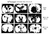 도 14는 식염수 (매일), 펩티드 ID 또는 펩티드 IW (2주 지연 후)로 처치된 래트에서 피질 종양 크기의 비교도이다.  사진 상의 어두운 영역은 종양의 존재를 나타낸다.  비교 사진은 2주 후의 펩티드 IW 투여가, 종양 이식 직후에 펩티드 ID를 투여한 경우와 유사한 종양 크기 감소를 일으켰음을 명확하게 나타낸다.