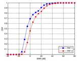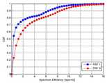 본 발명에 따른 분산 안테나 시스템에서 주파수 재사용의 성능 평가를 위해 기지국(eNB)과 소형 기지국(RRH) 모두 주파수를 재사용하지 않은 경우(FRF 1)와 소형 기지국(RRH)에 주파수 재사용률 3을 적용한 경우(FRF 3)에 대하여 비교 분석을 한다. 도 4와 5는 각각 전체 사용자 단말의 SINR 및 스펙트럼 효율에 대한 CDF를 보이고 있다.In the case of applying the