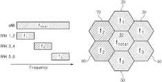 또한, 본 발명에 따른 상기 기지국(eNB)은, 셀 중심 영역에 위치하여 전체 주파수 대역을 사용하고, 상기 적어도 둘 이상의 소형 기지국(RRH)은, 상기 셀 중심 영역에 인접한 6개의 셀 경계 영역에 위치하고, 각각의 셀 경계 영역에 제1 소형 기지국(RRH), 제2 소형 기지국(RRH), 제3 소형 기지국(RRH), 제4 소형 기지국(RRH), 제5 소형 기지국(RRH), 제6 소형 기지국(RRH)으로 위치하고, 제1 소형 기지국(RRH), 제2 소형 기지국(RRH)은 제1 주파수 대역(), 제3 소형 기지국(RRH), 제4 소형 기지국(RRH)은 제2 주파수 대역(), 그리고 제5 소형 기지국(RRH), 제6 소형 기지국(RRH)은 제3 주파수 대역()을 사용하는 것을 특징으로 한다.Also, the base station (eNB) according to the present invention is located in a cell center area and uses the entire frequency band, and the at least two small base stations (RRH) are located in six cell boundary areas adjacent to the cell center area A first small base station RRH, a second small base station RRH, a third small base station RRH, a fourth small base station RRH, a fifth small base station RRH, The first small base station RRH and the second small base station RRH are located in a first frequency band ), The third small base station (RRH), and the fourth small base station (RRH) ), And the fifth small base station (RRH) and the sixth small base station (RRH) ) Is used.