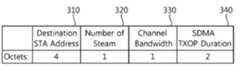 따라서 스테이션은 데이터 스트림의 개수 필드를 통해 AP가 데이터 스트림의 전송을 위해 사용하게 될 무선자원, 즉 물리 인터페이스(PHY interface) 의 개수를 알 수 있다. 채널 대역폭 필드(330)는 AP가 데이터 스트림의 전송에 사용할 채널 대역폭에 대한 정보를 포함한다. SDMA TXOP 지속시간 필드(340)는 하향링크 전송기회의 지속시간을 나타낸다.Therefore, the station can know the number of radio resources, that is, the physical interface (PHY interface), which the AP will use for transmission of the data stream through the number field of the data stream. The