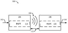 도 1은 본 발명의 다양한 예시적인 실시예들에 따른 무선 통신 시스템(100)을 나타낸다.  에너지 전달을 제공하기 위한 방사 필드(radiated field)(106)를 발생시키기 위해 송신기(104)에 입력 전력(102)이 제공된다.  수신기(108)는 방사 필드(106)에 커플링하고, 출력 전력(110)에 커플링된 (도시되지 않은) 디바이스에 의한 저장 또는 소비를 위한 출력 전력(110)을 발생시킨다.  송신기(104)와 수신기(108) 모두 거리(112)를 두고 분리된다.  예시적인 실시예에서, 송신기(104)와 수신기(108)는 상호 공진 관계에 따라 구성되고, 수신기(108)의 공진 주파수와 송신기(104)의 공진 주파수가 매우 가까울 때, 송신기(104)와 수신기(108) 사이의 전송 손실들은, 수신기(108)가 방사 필드(106)의 "근접장"에 로케이팅되는 경우에 최소가 된다.FIG. 1 illustrates a