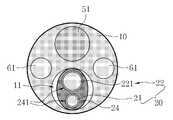 한편, 본 발명의 실시예에 따른 신체작용 파이버모듈(20)은 도 9에서와 같이 진단용 파이버(21)와 치료용 파이버(22)가 독립적으로 이동가능하게 수용되는 관통로(241)가 형성된 파이버 통합피복체(24)를 구비하여 파이버 통합피복체(24)가 프로브(10)의 내부통로(11)를 통과하도록 하게 된다.