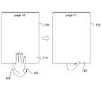 도 4에 도시된 예에서, 사용자의 조작은 전자 종이(100)의 앞면(110)을 보던 중, 전자 종이(100)를 뒤집어서 뒷면(120)을 보는 동작이다.  즉, 사용자는 401에서 402방향으로 전자 종이(100)를 뒤집는다.  이때, 사용자 조작 감지부(220)는 전자 종이(100)를 뒤집는 사용자의 조작을 감지한다.  이때, 전자 종이 제어부(230)는 전자 종이(100)를 뒤집는 사용자의 조작에 대응하여 전자 종이(100)에 디스플레이된 페이지를 변경하도록 상기 전자 종이(100)를 제어한다.  도 4에 도시된 예에서, 전자 종이(100)에 디스플레이된 페이지는 page10에서 page9로 변경되었다.  즉, 사용자는 401에서 402방향으로 전자 종이(100)를 뒤집음으로써, 현재 디스플레이된 페이지의 이전 페이지를 볼 수 있다.  한편, 전자 종이 제어부(230)는  401에서 402방향으로 전자 종이(100)를 뒤집는 사용자의 조작에 대응하여 page10에서 page11로 변경되도록 상기 전자 종이(100)를 제어할 수 도 있다.In the example shown in Fig. 4, the operation of the user is an operation of viewing the