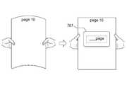 도 7에 도시된 예에서, 사용자의 조작은 전자 종이(100)를 책장을 넘기듯이 구부린 후 놓는 것이다.  이때, 사용자 조작 감지부(220)는 전자 종이(100)를 양손으로 구부린 후 놓는 사용자의 조작을 감지한다.  이때, 사용자 조작 감지부(220)는 전자 종이 양 측면이 사용자에 의해 터치된 후, 전자 종이(100)의 휘어짐을 감지함으로써, 전자 종이(100)를 양손으로 구부린 후 놓는 사용자의 조작을 감지할 수 있다.  이때, 전자 종이 제어부(230)는 전자 종이(100)를 양손으로 구부린 후 놓는 사용자의 조작에 대응하여 페이지 선택 메뉴(701)를 디스플레이 하도록 전자 종이(100)를 제어할 수 있다.  이때, 사용자는 페이지 선택 메뉴(701)에 원하는 페이지를 입력함으로써, 자신이 원하는 페이지로 이동할 수 있다.In the example shown in Fig. 7, the user's operation is to bend the