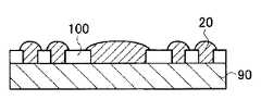 이때, 도 4에 있어서의 도금 공정에 있어서, 도 8에 도시하는 바와 같이 레지스트(100)의 높이보다도 도금에 의해 형성되는 안테나(20) 등의 금속의 높이를 높게 함으로써, 버섯과 같이 우산을 갖는 안테나(20) 등의 금속을 형성할 수 있다. 이와 같이 형성한 안테나(20) 등의 금속은, 스테인리스판(90)을 박리할 때에 밀봉재(10)에 확실하게 걸리므로, 일부 또는 전부가 스테인리스판(90)에 남아 버리는 문제를 효과적으로 막는다.At this time, in the plating process shown in Fig. 4, the height of the metal such as the