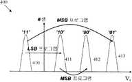 도 4는 도 2의 전압 할당 체계에 대한 예시적인 2단 MLC 프로그래밍 체계(400)를 도시한다.  도 4에 도시된 바와 같이, LSB 프로그램 단계 중에, 소거된 상태(410)에 있는 선택된 셀의 상태는 LSB가 0이면 최하위 프로그래밍된 상태(411)로 이동한다.  따라서, LSB 프로그래밍 단계에서, 메모리 셀은 소거된 상태 '11'로부터 '10'으로 프로그래밍된다.  다음, MSB 프로그램 단계 중에, 상태 '00'(412) 및 상태 '01'(413)은 이전의 LSB 데이터에 따라 순차적으로 형성된다.  일반적으로, MSB 프로그래밍 단계 중에, '10' 상태는 '00'으로 프로그래밍되고, 상태 '11'은 '01'로 프로그래밍된다.FIG. 4 illustrates an exemplary two-stage