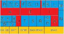 즉, 공통적인 큰 문제점은 가장 사용 빈도가 많은 문자와 가장 사용 빈도가 적은 문자에 할당된 자판의 면적이 같다는 것이다. 예를 들어 영어 입력 시 사용 빈도가 각각 약 7%대인 I, O 와 1% 및 0.2%대인 W, J 가 쿼티 자판과 3X4 키패드 모두 같은 면적을 사용하기 때문에 최대 35배의 불균형을 이루며, 특히 3x4 키패드인 경우에는 여기에 더해 I, O의 입력 시 3배의 횟수를 눌러야 하는 비능률이 추가적으로 발생하게 된다.That is, a common big problem is that the area of the key board allocated to the most frequently used character and the least frequently used character area is the same. For example, I, O, and 1% and 0.2% of W and J use the same area of about 7% each when using English input, resulting in an imbalance of up to 35 times, especially 3x4 In the case of a keypad, in addition to the above, inefficiency of pressing the number of times three times when inputting I and O is additionally generated.
