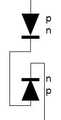 본 실시예에 따라서 제조된 태양전지는 상부셀과 하부셀이 기판을 중심으로 대칭 형태를 나타내는 구조이며, 태양전지 구성을 위한 회로도 형태로 표시하면 도 6에 도시된 것과 같이 pn접합이 반대방향으로 배열된 형태이다. 따라서 종래의 탠덤 태양전지와 같이 상부셀의 아래쪽 전극과 하부셀의 위쪽 전극을 전기적으로 연결하는 경우에는 전기가 흐르지 못하며, 후면전극(340)과 제1투명전극층(210)을 전기적으로 연결하거나 전면전극(240)과 제2투명전극층(310)을 전기적으로 연결하여야 한다. 한편, 상부셀과 하부셀을 직렬연결하지 않고 개별적으로 연결하는 4단자 구조에서도 태양전지 셀의 구조에 따른 전류의 방향을 고려하여야 한다.
