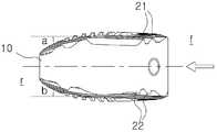 그리고, 본체(10)의 전방 상면은 도 5 및 도 6과 같이 제1 각도(a)로 라운드지게 하향 경사지고, 본체(10)의 후방 하면은 제1 각도(a)보다 작거나 같은 제2 각도(b)로 라운드지게 상향 경사지면서 유선형을 이룬다.The front upper surface of the