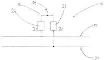 도 2a는 도 2의 기구 테스트 장치(18)를 개략적인 방식으로 도시한다.  테스트 전극(19)은 제 1 중성 도체(21)에 대한 접속부 뿐만 아니라, 제 2 중성 도체(22)에 대한 접속부를 포함한다.  제 1 중성 도체(21)에 대한 테스트 전극(19)의 접속부 또는 제 2 중성 도체(22)에 대한 테스트 전극(19)의 접속부의 각각은 제 1 임피던스(23)(Z1) 또는 제 2 임피던스(24)(Z2)를 각각 특징으로 한다.  이들 임피던스는, 도 2에 따른 예시적 실시예에서와 같이, 개별 전기 부품들에 의해 실현될 수 있다.  그러나, 예시적이면서 바람직한 방식에 있어서, 도 2b의 기구 테스트 장치에서와 같은 용량성 커플링이 캐패시턴스에 의해 형성될 수도 있는데, 이 캐패시턴스는 중성 도체 케이블(15)의 금속 요소와 중성 도체들(21, 22) 사이에 형성되며, 유전체로서의 케이블 절연체에 의해 전달된다.Figure 2a shows the